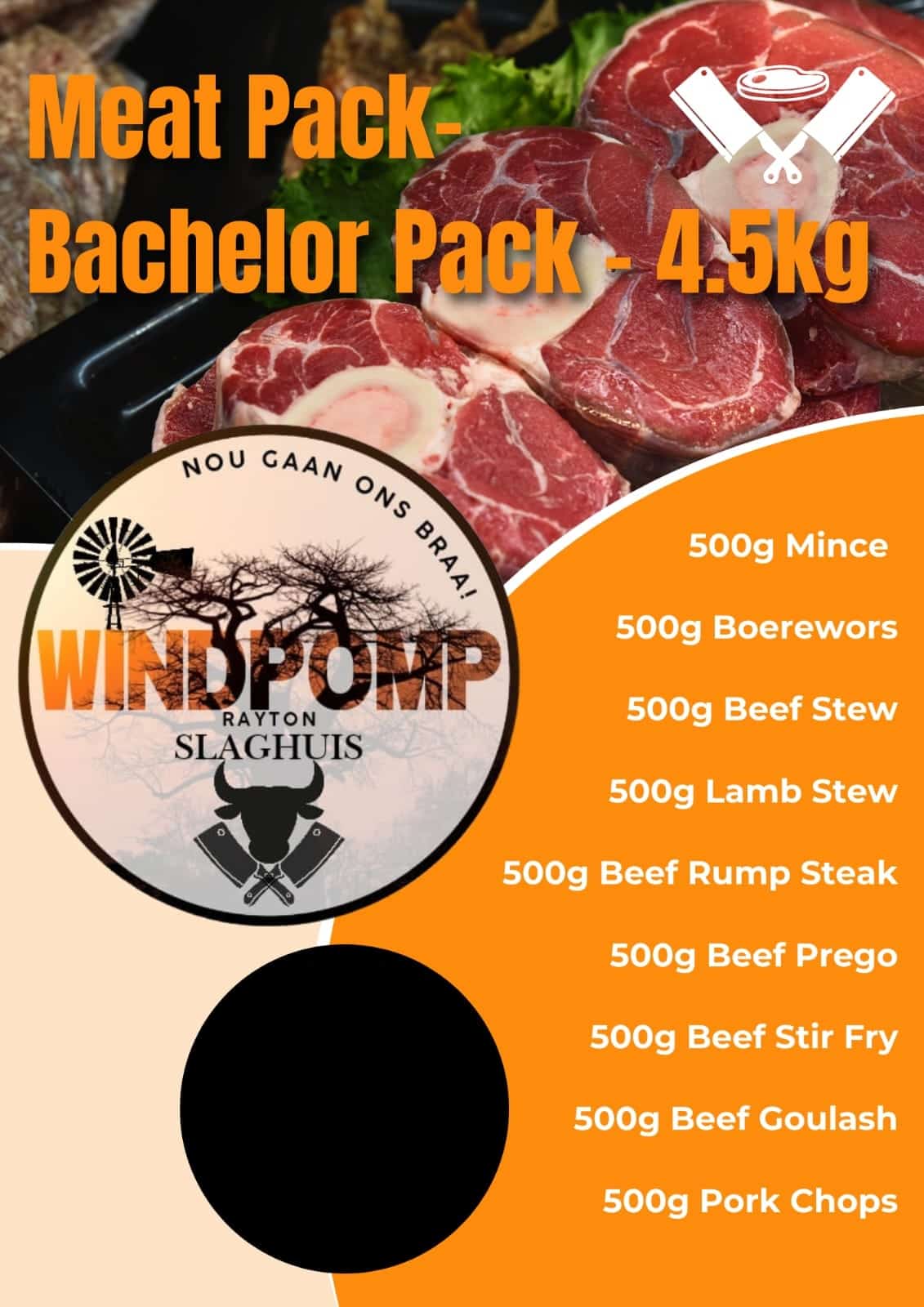 500g Mince, 500g Boerewors, 500g Beef Stew, 500g Lamb Stew, 500g Rump Steak, 500g Beef Prego, 500g Stir Fry, 500g Beef Goulash, 500g Pork Chops