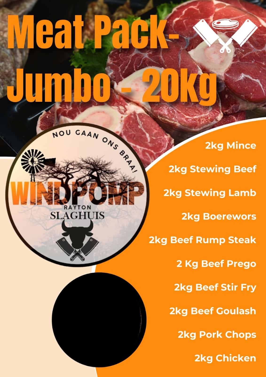 2kg Mince, 2kg Beef Stew, 2kg Lamb Stew, 2kg Boerewors, 2kg Rump Steak, 2kg Beef Prego, 2kg Rump Stir Fry, 2kg Beef Goulash, 2kg Pork Chops, 2kg Chicken Pieces